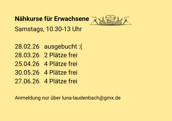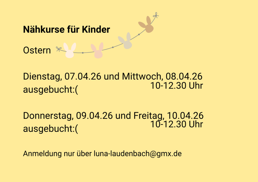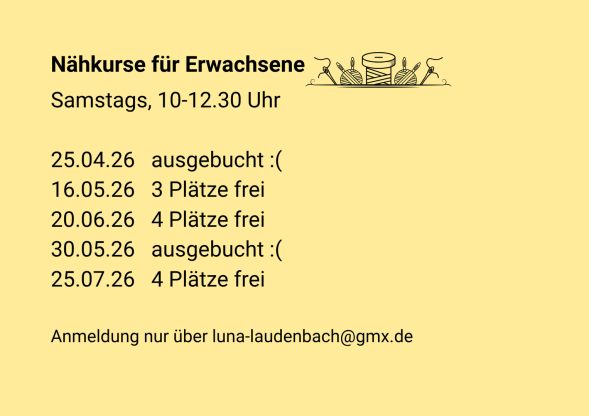 Auch hier kannst du eine Einheit von 2,5 Stunden buchen,falls du mit deinem Nähprojekt nicht fertig bist, gebe ich dir Anleitung wie du es zuhause schaffst oder du kommst ein weiteres Mal zu einem