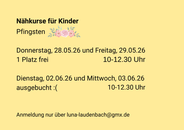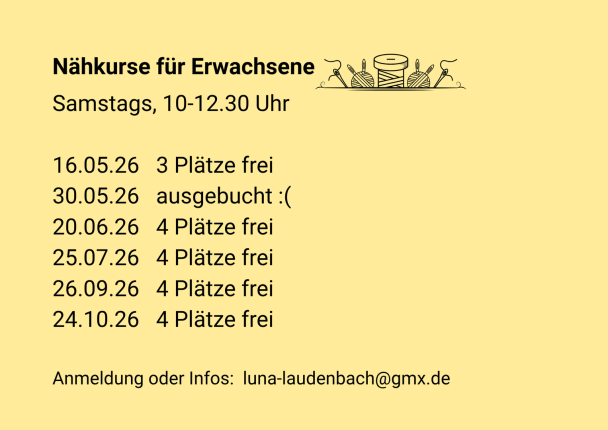 buchen,falls du mit deinem Nähprojekt nicht fertig bist, gebe ich dir Anleitung wie du es zuhause schaffst oder